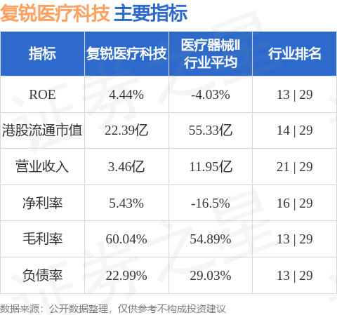 复锐医疗科技港股市值22.39亿港元,在医疗器械Ⅱ行业中排名第14。主要指标见下表: