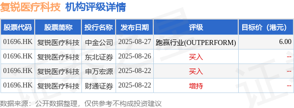 截至2025年10月28日收盘,复锐医疗科技(01696.HK)报收于4.66港元,下跌2.51%,成交量19.0万股,成交额90.89万港元。投行对该股的评级以买入为主,近90天内共有2家投行给出买入评级,近90天的目标均价为6港元。中金公司最新一份研报给予复锐医疗科技跑赢行业(OUTPERFORM)评级,目标价6港元。