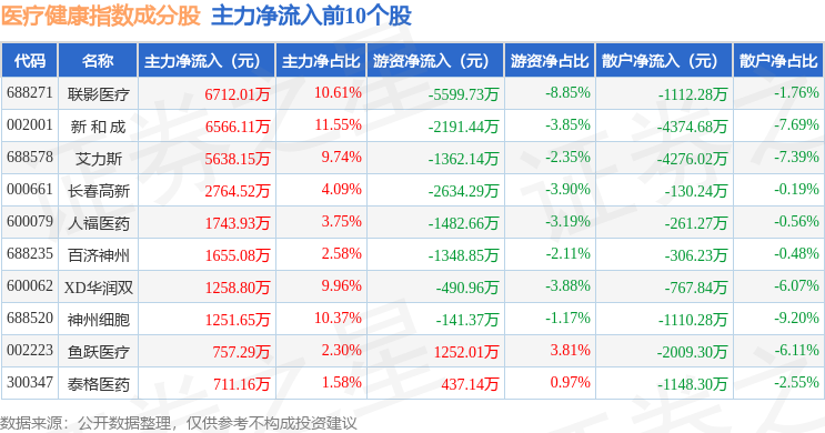 资金流向方面,医疗健康(980016)指数成份股当日主力资金净流出合计22.76亿元,游资资金净流入合计11.43亿元,散户资金净流入合计11.33亿元。成份股资金流向详情见下表: