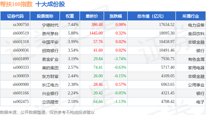 证券之星消息,10月28日,帮扶100(980065)指数报收于2180.58点,跌0.51%,成交2414.0亿元,换手率0.43%。当日该指数成份股中,上涨的有29家,三花智控以8.21%的涨幅领涨,下跌的有69家,恒瑞医药以5.06%的跌幅领跌。