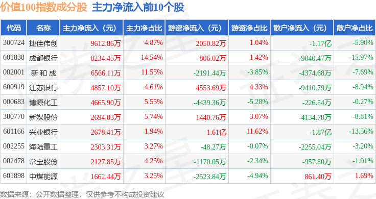 资金流向方面,价值100(980081)指数成份股当日主力资金净流出合计19.26亿元,游资资金净流入合计12.88亿元,散户资金净流入合计6.38亿元。成份股资金流向详情见下表: