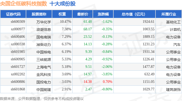 央国企低碳科技(980082)指数十大成份股详情如下: