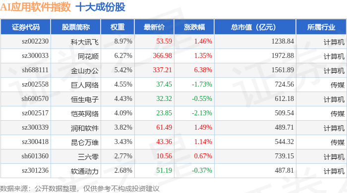 AI应用软件(980107)指数十大成份股详情如下: