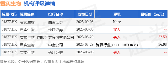 截至2025年10月28日收盘,君实生物(01877.HK)报收于25.16港元,下跌3.08%,成交量304.65万股,成交额7740.74万港元。投行对该股的评级以买入为主,近90天内共有3家投行给出买入评级,近90天的目标均价为34.74港元。西南证券最新一份研报给予君实生物None评级。