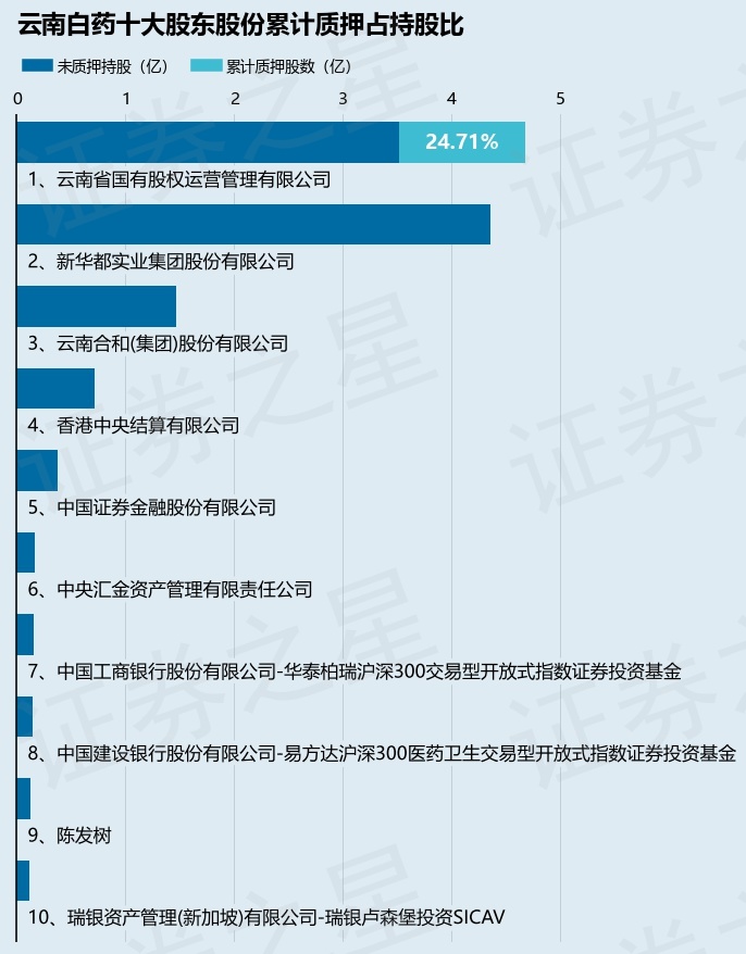 截止本公告日,股东云南省国有股权运营管理有限公司已累计质押股份1.16亿股,占其持股总数的24.71%。本次质押后云南白药十大股东的累计质押股份占持股比例(占持股比例的计算以公司最新一期财务报表公布的十大股东的持股总数为基准)见下图: