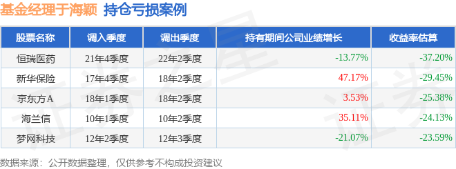 于海颖管理的交银鸿信一年持有期混合A基金在21年4季度买入恒瑞医药,在持有2个季度后在22年2季度卖出。持有期间的估算收益率为-37.2%,持有期间恒瑞医药在2021年到2022年的年报归属净利润降幅为13.77%。