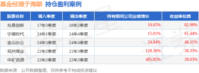 于海颖管理的交银增利增强债券A基金在17年3季度买入兆易创新,在持有3个季度后在18年2季度卖出。持有期间的估算收益率为82.98%,持有期间兆易创新在2017年到2018年的年报营业总收入增幅达10.65%。