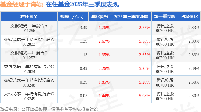 证券之星消息,截止2025年三季度末,基金经理于海颖旗下共管理6只基金,本季度表现最佳的为交银鸿信一年持有期混合A(012833),季度净值涨5.38%。