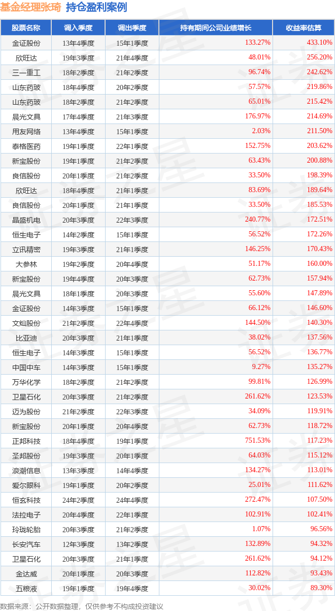 张琦管理的中银优选灵活配置混合A基金在13年4季度买入金证股份,在持有1年又1个季度后在15年1季度卖出。持有期间的估算收益率为433.1%,持有期间金证股份在2013年到2015年的年报归属净利润增幅达133.27%。