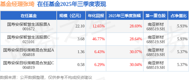 证券之星消息,截止2025年三季度末,基金经理张琦旗下共管理4只基金,本季度表现最佳的为国寿安保目标策略混合发起A(004818),季度净值涨30.07%。