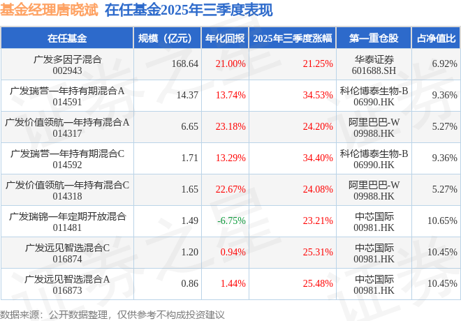 证券之星消息,截止2025年三季度末,基金经理唐晓斌旗下共管理8只基金,本季度表现最佳的为广发瑞誉一年持有期混合A(014591),季度净值涨34.53%。