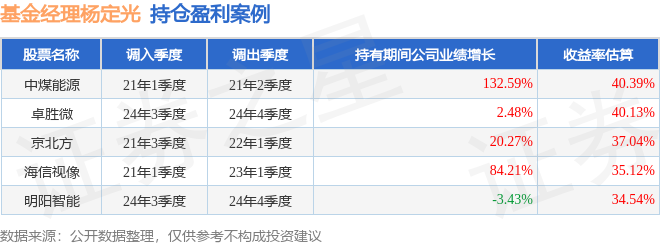 杨定光管理的广发创新驱动灵活配置混合基金在21年1季度买入中煤能源,在持有1个季度后在21年2季度卖出。持有期间的估算收益率为40.39%,持有期间中煤能源在2020年到2021年的年报归属净利润增幅达132.59%。