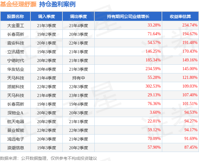 舒灏管理的华安安禧混合A基金在21年3季度买入大金重工,在持有1个季度后在21年4季度卖出。持有期间的估算收益率为234.74%,持有期间大金重工在2020年到2021年的年报营业总收入增幅达33.28%。