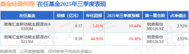 证券之星消息,截止2025年三季度末,基金经理何翔旗下共管理2只基金,本季度表现最佳的为渤海汇金新动能主题混合A(010584),季度净值涨10.44%。