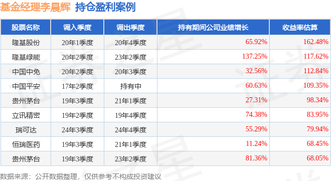 李晨辉管理的东兴众智优选混合基金在20年1季度买入隆基股份,在持有3个季度后在20年4季度卖出。持有期间的估算收益率为162.48%,持有期间隆基股份在2019年到2020年的年报营业总收入增幅达65.92%。
