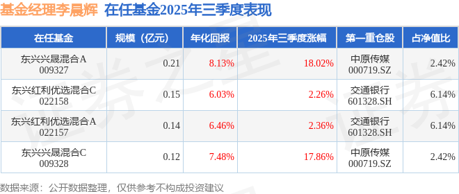 证券之星消息,截止2025年三季度末,基金经理李晨辉旗下共管理4只基金,本季度表现最佳的为东兴兴晟混合A(009327),季度净值涨18.02%。