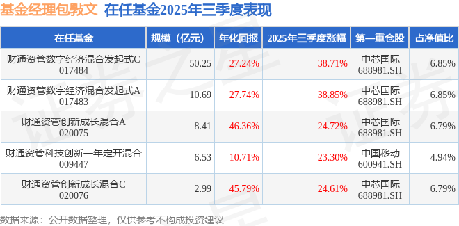 包斅文管理的财通资管科技创新一年定开混合基金在24年3季度买入海光信息,在持有1个季度后在24年4季度卖出。持有期间的估算收益率为69.47%,持有期间海光信息在2023年到2024年的年报归属净利润增幅达52.87%。