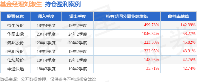 刘淑生管理的汇丰晋信2026周期混合基金在18年4季度买入益生股份,在持有2个季度后在19年2季度卖出。持有期间的估算收益率为142.39%,持有期间益生股份在2018年到2019年的年报归属净利润增幅达499.73%。