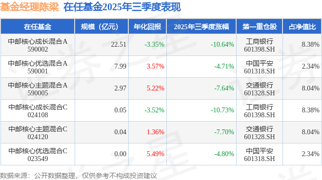 证券之星消息,截止2025年三季度末,基金经理陈梁旗下共管理6只基金,本季度表现最佳的为中邮核心优选混合A(590001),季度净值跌4.71%。