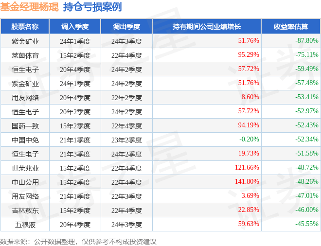 杨琨管理的诺安新动力灵活配置混合A基金在24年1季度买入紫金矿业,在持有2个季度后在24年3季度卖出。持有期间的估算收益率为-87.8%,持有期间紫金矿业在2023年到2024年的年报归属净利润增幅达51.76%。