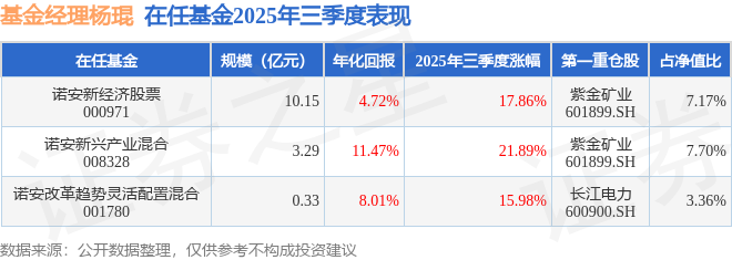 证券之星消息,截止2025年三季度末,基金经理杨琨旗下共管理3只基金,本季度表现最佳的为诺安新兴产业混合(008328),季度净值涨21.89%。