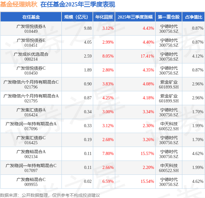证券之星消息,截止2025年三季度末,基金经理姚秋旗下共管理12只基金,本季度表现最佳的为广发成长优选混合(000214),季度净值涨17.41%。