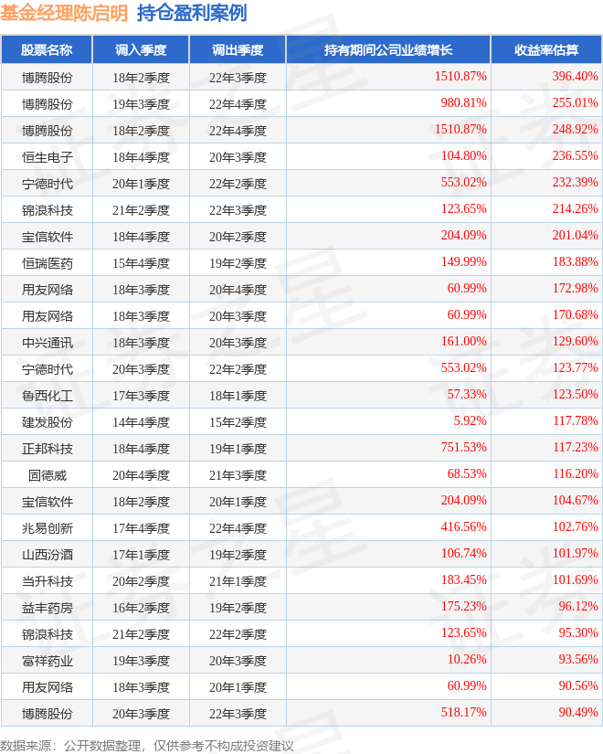 陈启明管理的华富价值增长混合A基金在18年2季度买入博腾股份,在持有4年又1个季度后在22年3季度卖出。持有期间的估算收益率为396.4%,持有期间博腾股份在2018年到2022年的年报归属净利润增幅达1510.87%。