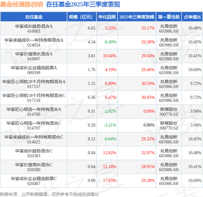 证券之星消息,截止2025年三季度末,基金经理陈启明旗下共管理12只基金,本季度表现最佳的为华富成长趋势混合A(410003),季度净值涨33.17%。