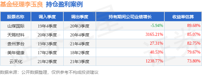 李玉良管理的诺安景鑫灵活配置混合基金在20年3季度买入天赐材料,在持有1个季度后在20年4季度卖出。持有期间的估算收益率为85.07%,持有期间天赐材料在2019年到2020年的年报归属净利润增幅达3165.21%。