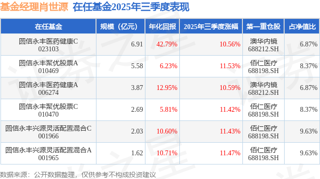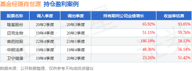 肖世源管理的圆信永丰双利优选基金在19年4季度买入迈克生物,在持有2个季度后在20年2季度卖出。持有期间的估算收益率为59.76%,持有期间迈克生物在2019年到2020年的年报归属净利润增幅达51.15%。