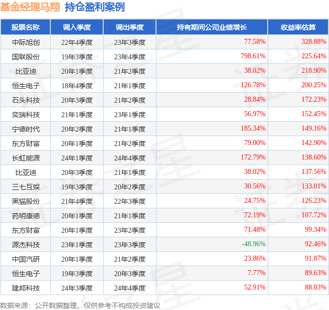 马翔管理的汇添富创新增长一年定开混合A基金在22年4季度买入中际旭创,在持有3个季度后在23年3季度卖出。持有期间的估算收益率为328.88%,持有期间中际旭创在2022年到2023年的年报归属净利润增幅达77.58%。