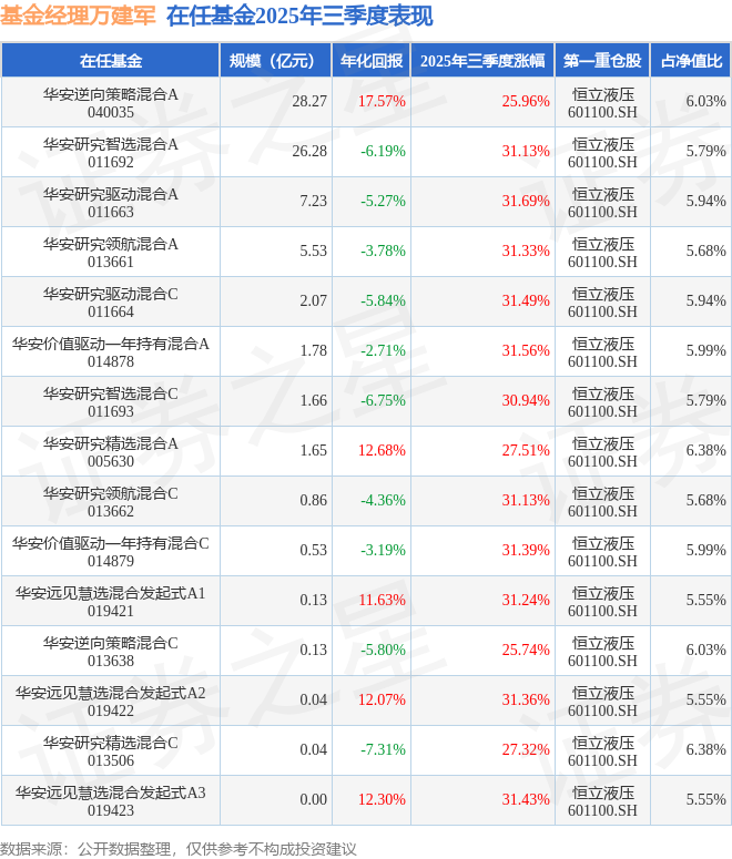 万建军在担任华安研究精选混合A(005630)基金经理的任职期间累计任职回报147.9%,平均年化收益率为12.63%。期间重仓股调仓次数共有145次,其中盈利次数为106次,胜率为73.1%;翻倍级别收益有7次,翻倍率为4.83%。