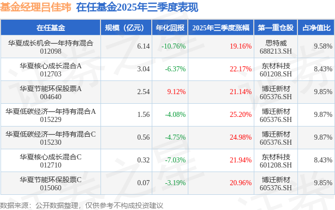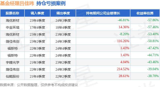 吕佳玮管理的华夏低碳经济一年持有混合A基金在23年4季度买入海优新材,在持有3个季度后在24年3季度卖出。持有期间的估算收益率为-57.86%,持有期间海优新材在2023年到2024年的年报营业总收入降幅为46.81%。