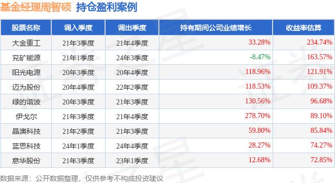 周智硕管理的建信优化配置混合A基金在21年3季度买入大金重工,在持有1个季度后在21年4季度卖出。持有期间的估算收益率为234.74%,持有期间大金重工在2020年到2021年的年报营业总收入增幅达33.28%。