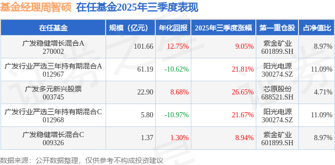 证券之星消息,截止2025年三季度末,基金经理周智硕旗下共管理5只基金,本季度表现最佳的为广发多元新兴股票(003745),季度净值涨26.65%。
