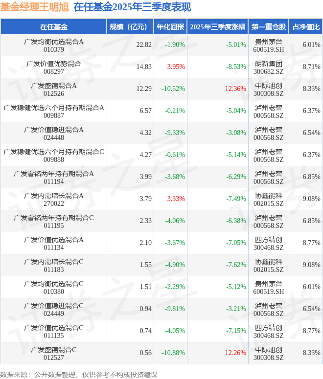 证券之星消息,截止2025年三季度末,基金经理王明旭旗下共管理15只基金,本季度表现最佳的为广发盛锦混合A(012526),季度净值涨12.36%。