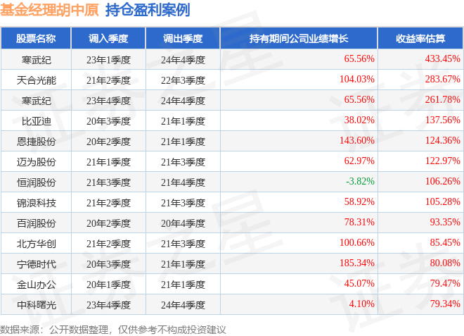 胡中原管理的华商双翼平衡混合A基金在23年1季度买入寒武纪,在持有1年又3个季度后在24年4季度卖出。持有期间的估算收益率为433.45%,持有期间寒武纪在2023年到2024年的年报营业总收入增幅达65.56%。