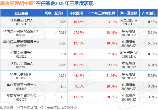 证券之星消息,截止2025年三季度末,基金经理胡中原旗下共管理8只基金,本季度表现最佳的为华商元亨混合A(004206),季度净值涨52.11%。