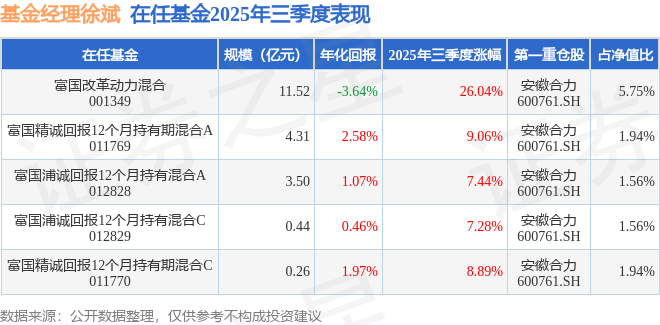证券之星消息,截止2025年三季度末,基金经理徐斌旗下共管理5只基金,本季度表现最佳的为富国改革动力混合(001349),季度净值涨26.04%。