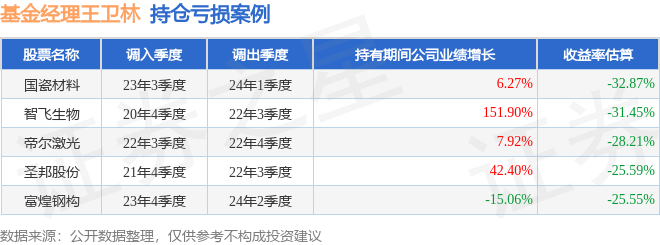 王卫林管理的光大中证500指数增强A基金在23年3季度买入国瓷材料,在持有2个季度后在24年1季度卖出。持有期间的估算收益率为-32.87%,持有期间国瓷材料在2023年到2024年的年报归属净利润增幅达6.27%。