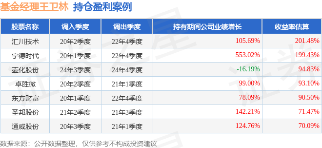 王卫林管理的长城创业板指数增强A基金在20年2季度买入汇川技术,在持有2年又2个季度后在22年4季度卖出。持有期间的估算收益率为201.48%,持有期间汇川技术在2020年到2022年的年报归属净利润增幅达105.69%。
