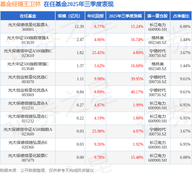 证券之星消息,截止2025年三季度末,基金经理王卫林旗下共管理11只基金,本季度表现最佳的为光大创业板量化优选A(003069),季度净值涨40.17%。