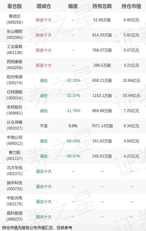 证券之星消息,10月28日广发基金旗下刘格菘管理的广发科技先锋混合型基金公布三季报,近1年净值增长率23.55%。与上一季度相比,该基金前十大重仓股新增寒武纪,东山精密,工业富联,药明康德;其中阳光电源持仓占比10.39%,为该基金第一大重仓股;北方华创,振华科技,中航光电,晶科能源等退出前十大重仓股;详细数据如下:
