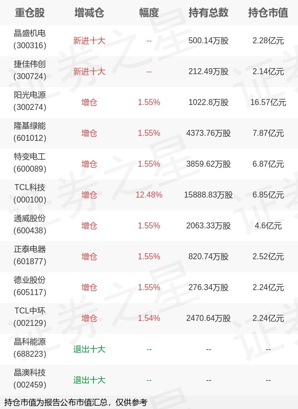 证券之星消息,10月28日天弘基金旗下祁世超管理的天弘中证光伏产业指数型发起式基金公布三季报,近1年净值增长率5.64%。与上一季度相比,该基金前十大重仓股新增晶盛机电,捷佳伟创;并对阳光电源增仓15.57万股,为该基金第一大重仓股;晶科能源,晶澳科技等退出前十大重仓股;详细数据如下: