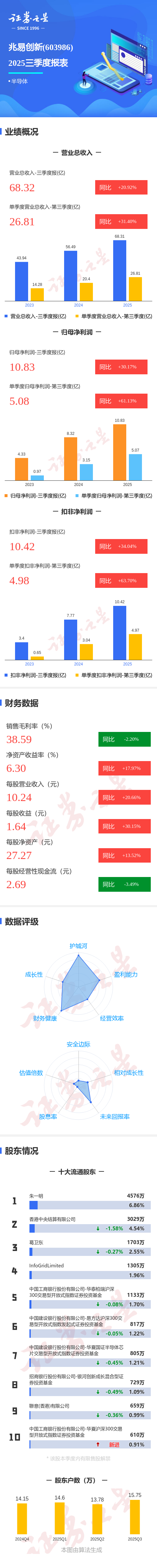 证券之星消息,兆易创新2025年三季报显示,公司主营收入68.32亿元,同比上升20.92%;归母净利润10.83亿元,同比上升30.18%;扣非净利润10.42亿元,同比上升34.04%;其中2025年第三季度,公司单季度主营收入26.81亿元,同比上升31.4%;单季度归母净利润5.08亿元,同比上升61.13%;单季度扣非净利润4.98亿元,同比上升63.71%;负债率11.35%,投资收益-1576.35万元,财务费用-1.68亿元,毛利率38.59%。
