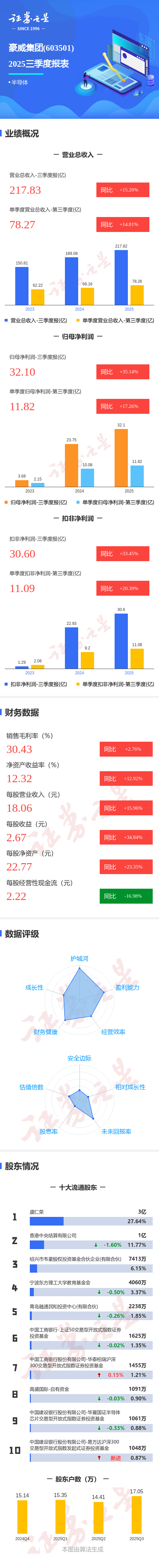 证券之星消息,豪威集团2025年三季报显示,公司主营收入217.83亿元,同比上升15.2%;归母净利润32.1亿元,同比上升35.15%;扣非净利润30.6亿元,同比上升33.45%;其中2025年第三季度,公司单季度主营收入78.27亿元,同比上升14.81%;单季度归母净利润11.82亿元,同比上升17.26%;单季度扣非净利润11.09亿元,同比上升20.4%;负债率37.34%,投资收益5467.43万元,财务费用-3398.25万元,毛利率30.43%。