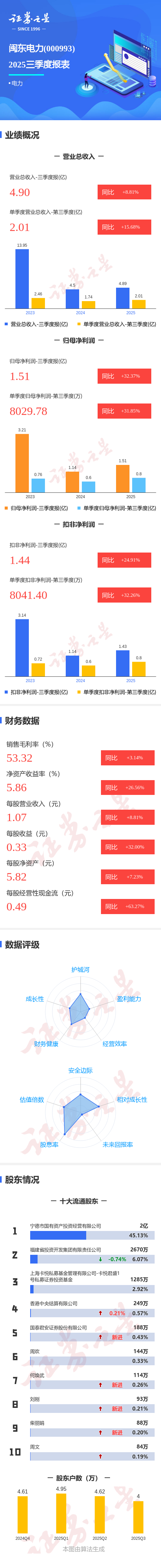 证券之星消息,闽东电力2025年三季报显示,公司主营收入4.9亿元,同比上升8.81%;归母净利润1.51亿元,同比上升32.38%;扣非净利润1.44亿元,同比上升24.91%;其中2025年第三季度,公司单季度主营收入2.01亿元,同比上升15.68%;单季度归母净利润8029.78万元,同比上升31.86%;单季度扣非净利润8041.4万元,同比上升32.27%;负债率27.79%,投资收益2140.05万元,财务费用1508.13万元,毛利率53.32%。