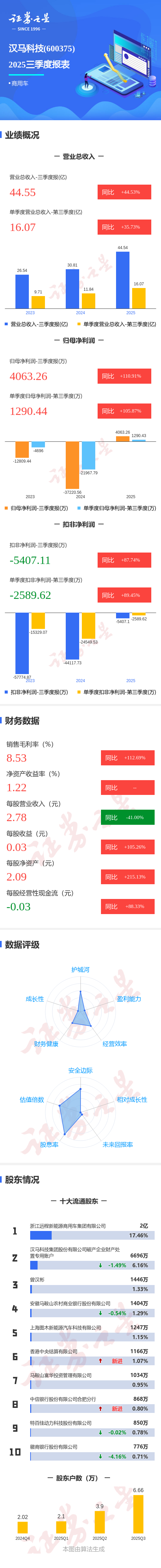 证券之星消息,汉马科技2025年三季报显示,公司主营收入44.55亿元,同比上升44.54%;归母净利润4063.26万元,同比上升110.92%;扣非净利润-5407.11万元,同比上升87.74%;其中2025年第三季度,公司单季度主营收入16.07亿元,同比上升35.74%;单季度归母净利润1290.44万元,同比上升105.87%;单季度扣非净利润-2589.62万元,同比上升89.45%;负债率59.77%,投资收益-23.38万元,财务费用4578.75万元,毛利率8.53%。