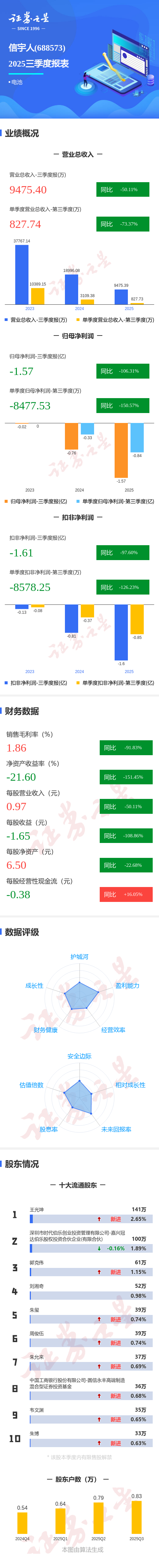 证券之星消息,信宇人2025年三季报显示,公司主营收入9475.4万元,同比下降50.12%;归母净利润-1.57亿元,同比下降106.31%;扣非净利润-1.61亿元,同比下降97.61%;其中2025年第三季度,公司单季度主营收入827.74万元,同比下降73.38%;单季度归母净利润-8477.53万元,同比下降150.58%;单季度扣非净利润-8578.25万元,同比下降126.24%;负债率69.43%,投资收益314.56万元,财务费用622.3万元,毛利率1.86%。