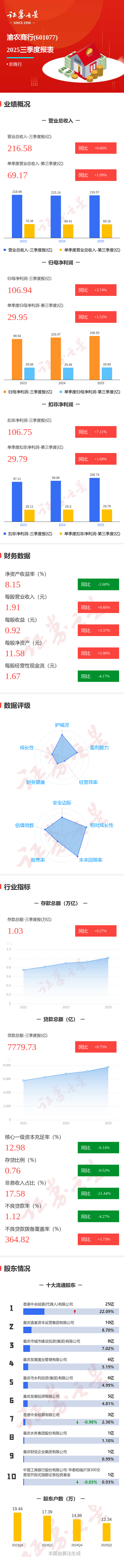 证券之星消息,渝农商行2025年三季报显示,公司主营收入216.58亿元,同比上升0.67%;归母净利润106.94亿元,同比上升3.74%;扣非净利润106.75亿元,同比上升7.11%;其中2025年第三季度,公司单季度主营收入69.17亿元,同比上升1.1%;单季度归母净利润29.95亿元,同比上升1.53%;单季度扣非净利润29.79亿元,同比上升1.68%;负债率91.56%,投资收益34.95亿元。